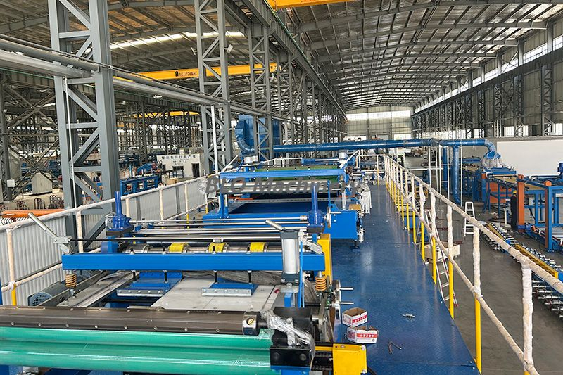 1.Feed facing material: Steel coils are decoiled, leveled, trimmed/slit to width. If profiled facings are needed (ribbed, corrugated), roll forming occurs here.